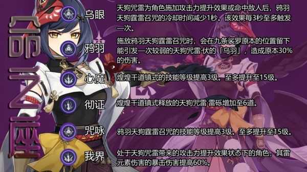 从九条的命之座组合来看,几个关键命之座还是围绕着“天狗雷咒”这一核心buff,满命情况下九条的辅助便利性和增伤强度都有大幅提高。其中二命是较为重要的命之座,不用重击就能吃到buff这一点太重要了,在实战中想打出九条E技能的蓄力攻击是非常容易出现失误的。而六命的高额爆伤值得每个玩家追求,60%的高额数值可以将原本的雷队输出提升一个档次,如果你的主C是雷神的话那么更应该想办法搞一个六命九条出来。