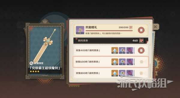 获得200剧戏票券即可领取【究极霸王超级魔剑】。