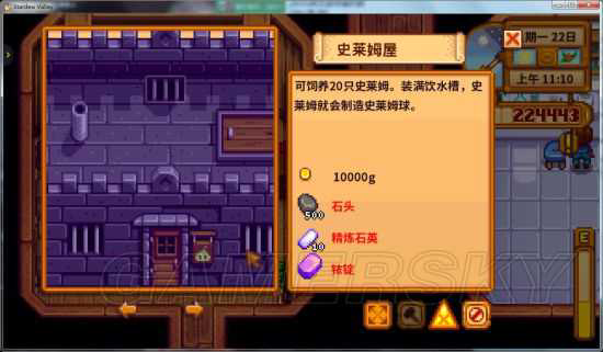然而机智的小伙伴们并不会做这么傻乎乎去刷矿洞这种事,今天我就来告诉大家一个简单的方法快速刷到1000只史莱姆!那就是建造史莱姆养殖房!