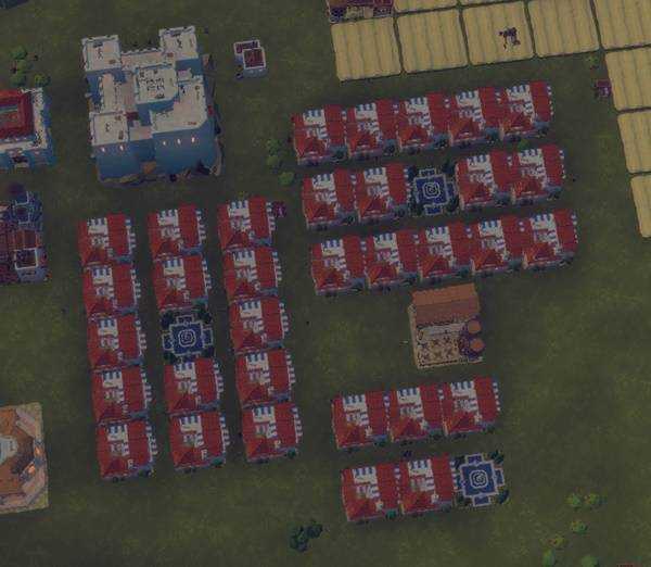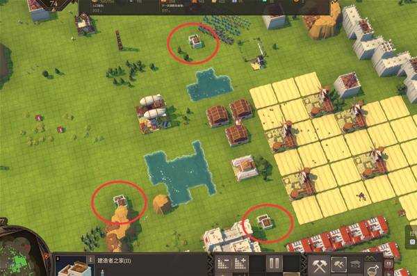 前期一定要注意居民屋的摆放,因为在二级市政厅时我们可以建造喷水池(增加居民屋人口)和酒馆(减少居民食物消耗),要保证两者对居民屋的完全覆盖。此外,因为居民屋都是大片坐落在一起,一定要留够足够的空隙,不仅是要保证工人能够完成建造,还要确保不会阻挡工人搬运资源的路线,防止其绕路。