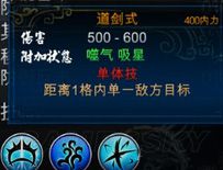 道剑式:500-600/400内/1格/0范围伤害/2cd/噬气/吸星