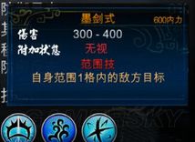 墨剑式:300-400/600内/1格/1范围伤害/4cd/无视