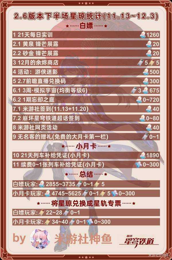 《崩坏星穹铁道》2.6下半版本即将到来,那么在2.6下半版本总共可以获取到少星琼呢?下面请看由“神鱼”为大家带来的《崩坏星穹铁道》2.6下半可获取星琼数量统计,希望可以帮助到大家。