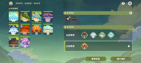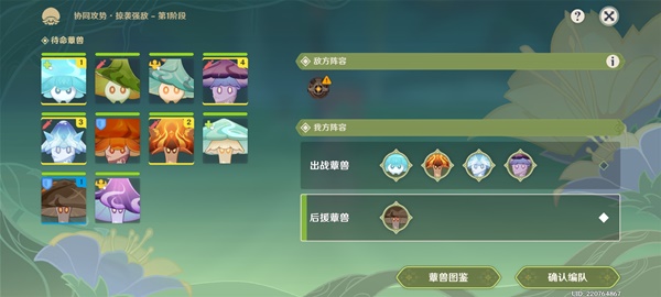 第一阶段比较简单,推荐携带三个攻击性的蕈兽,一个治疗蕈兽,一分钟能解决掉战斗,下图是我的配对↓