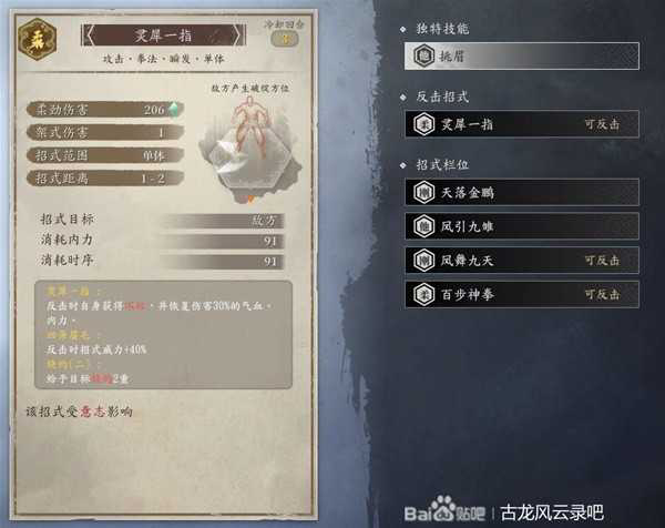 反击必须放灵犀一指。双回,高伤害,2层灼烧,完美。唯一不足是消耗内力较高。在40级之前,可以用少林送的罗汉伏虎拳代替,伤害差很多,但是叠的回血和回蓝buff不错。(少林送的一套心法和拳法基本都可以给陆小凤用,可以说从第一章开始,陆小凤就从1到45完美过渡,没有瓶颈。)