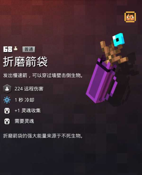 还有一个原因就是,折磨箭袋作为灵魂法器,它给的箭矢杀敌是不会掉落灵魂的。但是你折磨箭不掉灵魂和我毒雾有什么关系,如此一来就可以在对大量怪物使用折磨箭的时候,可以回收大量灵魂(对,说的就是刷蘑菇牛的时候)。