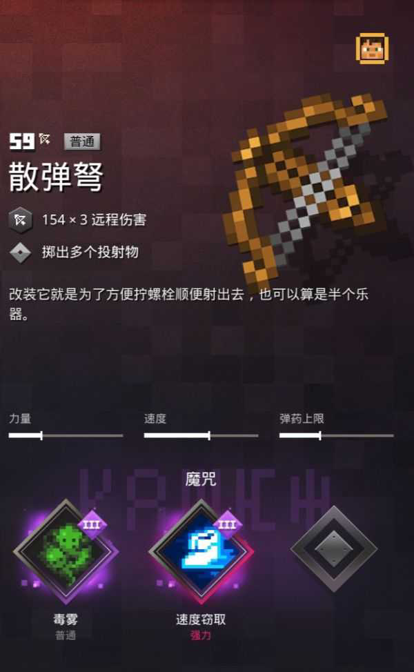 折磨箭袋是吃多重射击(40%概率发射5支箭)特效的,但是由于是概率触发,所以不够稳定,故选择普通的散弹弩即可。