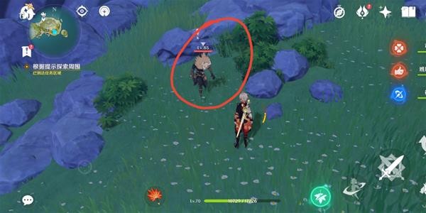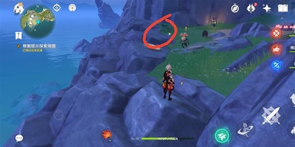 接着回到小岛上,到达图示地点,有一个正在挖土的丘丘人,他挖掘的地方就是我们要探索的点位。