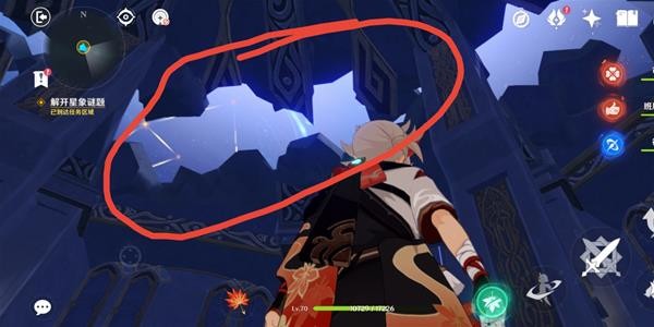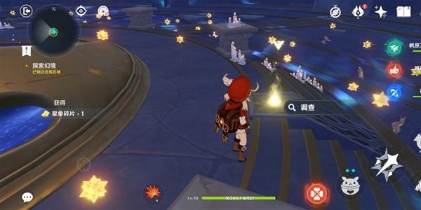 首次进入秘境,任务会提示我们进行探索,直接打开元素视野,调查所有光点,得到3块星象碎片