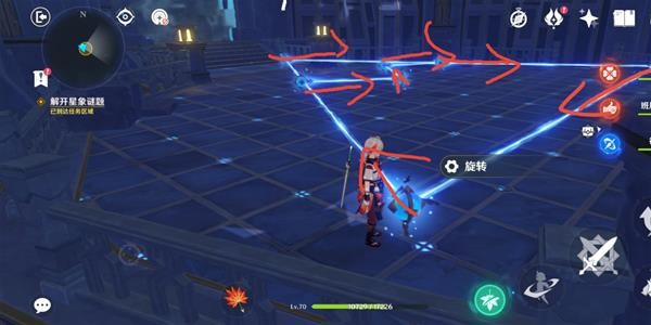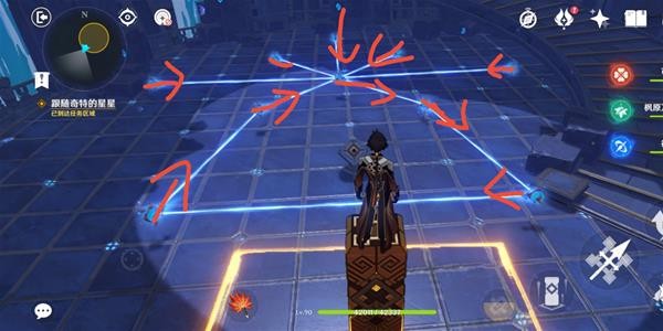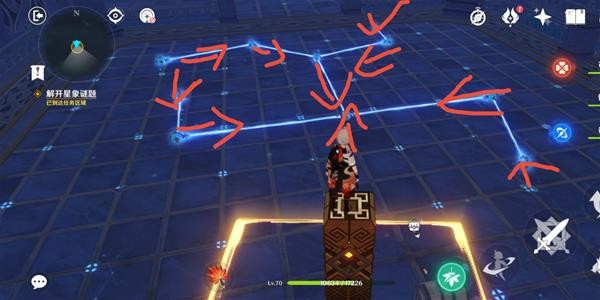 此时对应星门开启,进入后出现连线机关,需要将机关连成头顶上方的形状