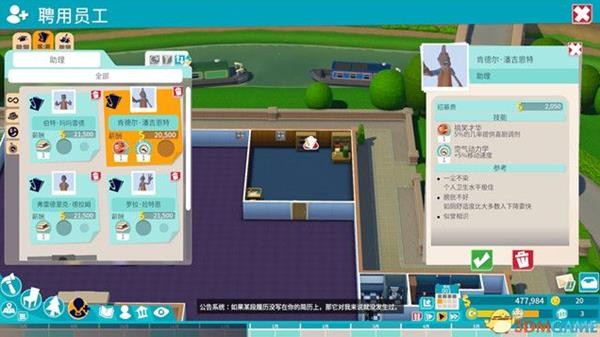 (小技巧:优先建造一个员工休息室,并在休息室中拜访一些娱乐设施,之后再雇佣两名勤杂工。)