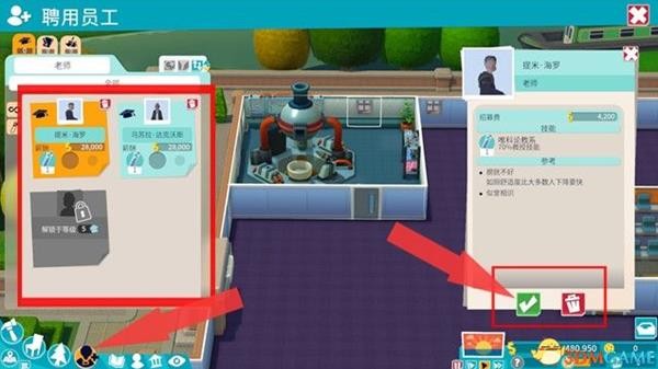 打开雇佣人员面板,选择【老师】面板,选择一名应聘的求职者,对号将他应聘进来。