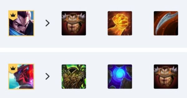 因为我们这套阵容需要的装备都不是特别需要抢的,前期一般做的都是正义之拳和反甲,所以我们就要尽可能的去拿连胜。那么为了保证我们能够一直连胜下去,我们就需要拿到前期足够强的天选羁绊,比如说天选决斗亚索,一般玩亚索的决斗阵容就一定要天选决斗亚索,没有的话就不太建议大家走这套阵容,特别是如果有天选决斗剑姬千万不要拿,因为我们后期6决斗大师是不要剑姬的。前期即使拿了天选决斗剑姬对我们来说根本是没有什么用。