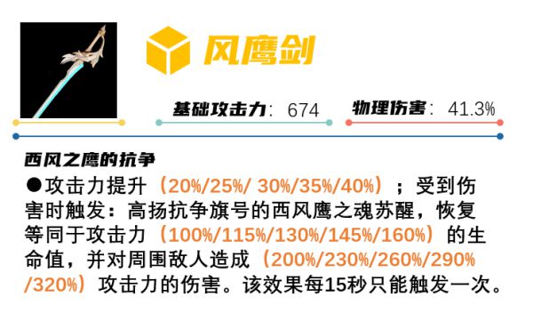 物理向输出性武器,虽然基础攻击力加成不如松籁,但在众多单手剑中,风鹰剑仍位居首位。不同的是,与松籁相比,风鹰剑牺牲部分基础攻击力,更加注重物理伤害加成,高额物伤加成对于物伤刻晴、主C凯亚而言有非常高的提升,同时其高额的基础攻击力对于班尼特的辅助输出能力的提升而言,是目前最优选择。武器特效常驻的20%攻击力加成虽然非常通用,但数值较为平庸,由于其副词条提供高额物伤加成,本身已非常倾向物理专用,此处增加20%攻击力加成虽然考虑到其通用性,但风鹰剑作为通用输出武器时已元气大伤,定位冲突。15秒一次的恢复与伤害效果,对于前期玩家可以一定程度上提升角色生存能力,但对于有一定积累的老玩家而言作用甚微。风鹰剑本身为开服旧版武器,上限较磐岩结绿、斫峰之刃更低,保值性也有些许堪忧,不推荐专门抽取。
