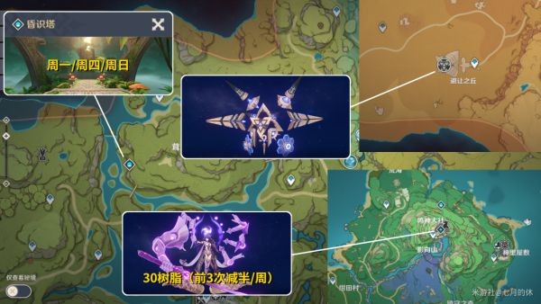 天赋突破材料:诤言系列(昏识塔——周一/周四/周日)、祸神之锲泪(周本boss雷神)