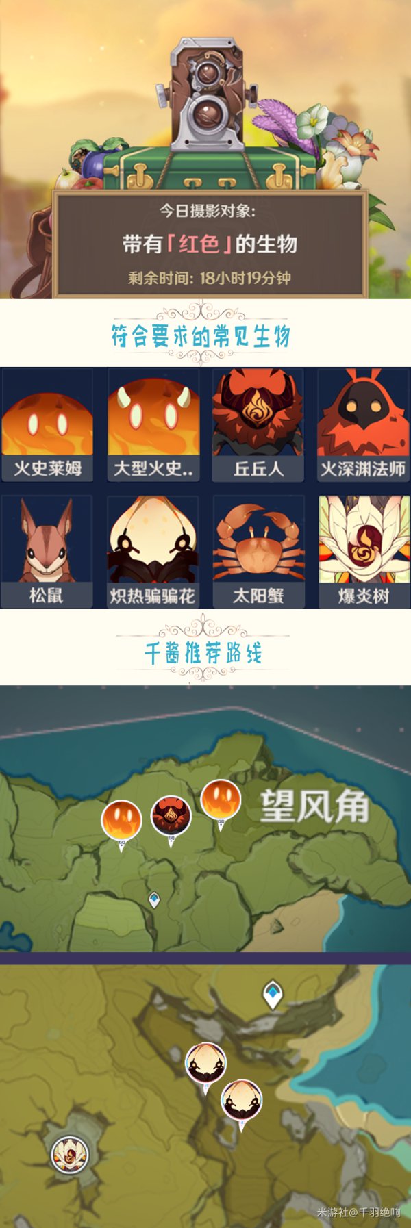 《原神》福至五彩活动正在进行,今天玩家们需要拍摄带有红色的生物,那么这些生物有哪些,要去哪里找呢?请看玩家“千羽绝响”分享的《原神》福至五彩活动第三天拍照指南,希望能为各位玩家带来一些帮助。