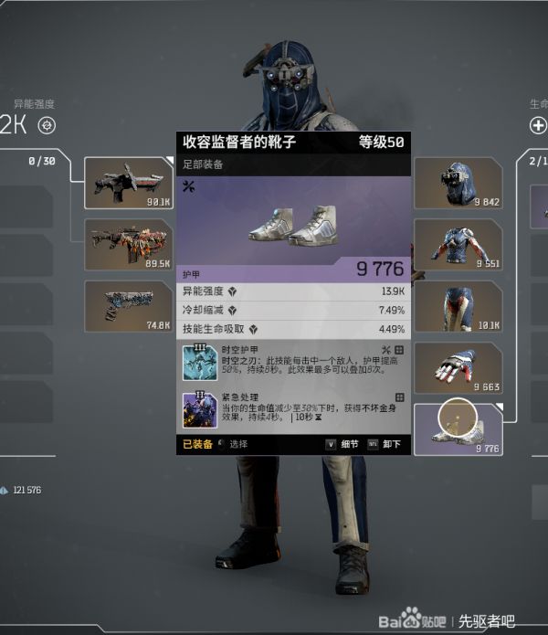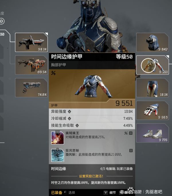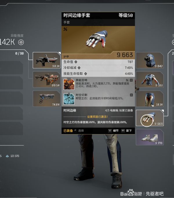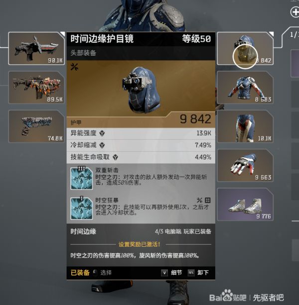 核心装备是【时间边缘】套装三件套,分别是头部、胸甲、裤子。其中图片手部技能MOD是对的,但是没刷出词条为异能强度的,面板少10K异能。