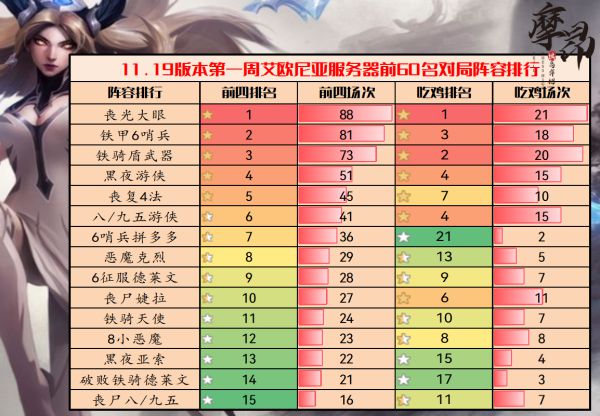 让摩昂意想不到的是铁骑盾武器阵容,这周强势崛起,前四场次大幅度增加,吃鸡排名更是超越了铁甲6哨兵阵容成为版本吃鸡排行第二名。这三套阵容可成为是当前版本吃分最稳的阵容。