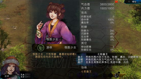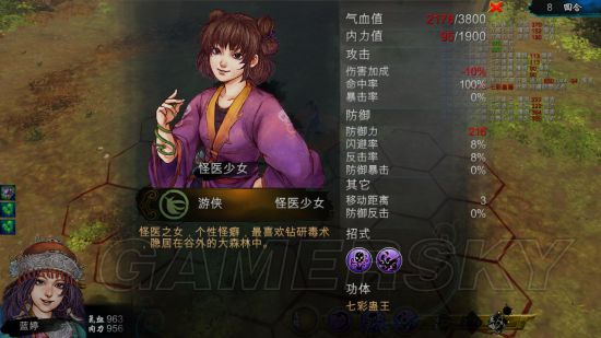 虽然招式不给力,但是蓝婷妹子的心法可以比例扣除周遭两格敌人的气血以及内力…