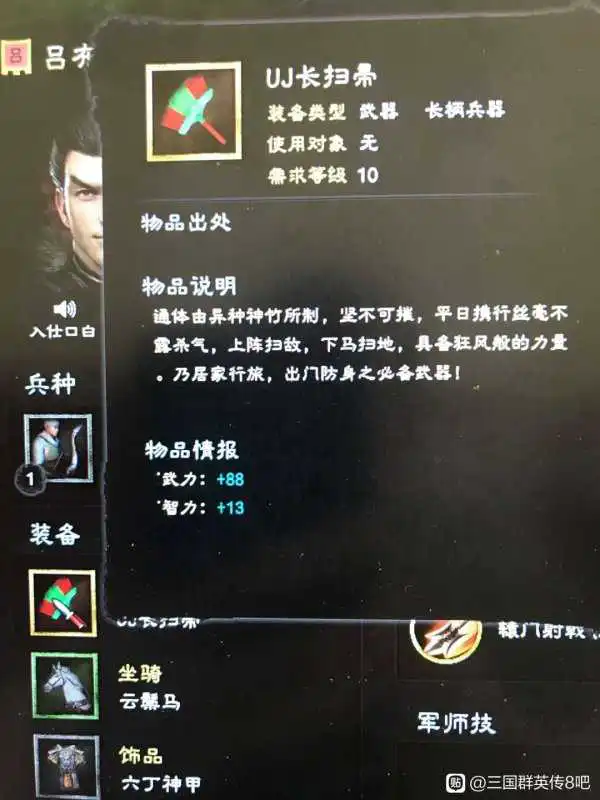 3.国库:可以点选装备后直接点选下方选取,就会出现可以使用该装备的所有武將及装备状态,这个系统做的比较好。物品搜索每座城池自动进行,城池越多每个月到手的装备越多。依照惯例,占领了夷州会出现UJ琼楼,游戏会得到UJ各类卡(攻打山寨可以概率得卡或者稀有武器,消息提示出现金光的地方也可以得卡),集满五张可以在UJ琼楼换到神器(比如特技Uj风暴之力,普攻将更改为龙卷风 Uj长扫帚,武力+88,智力+13,具有狂风般的力量)。游戏内会出现残破卷轴,使用后可能出现山海经进度(具体内容没接触,不评论,话说怎么都开始山海经?LOL最近也是,哈哈哈,中国文化博大精深,山海经确实挺有神话色彩),內容会说明某些特定地区的讯息指点(莫搞清楚,楼下欢迎补充)