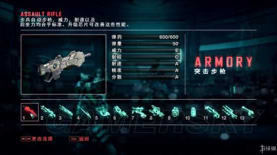 突击步枪(ASSAULT RIFLE):比较好用的武器,虽然威力不高,但是射速块,弹药量充足,精准度也很高。