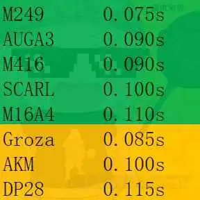 共2/14,2*60+14*2=148帧,其中一帧为1/60s,因此Groza射击间隔约为0.085s,同理得出:
