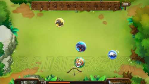 (限时、限血小游戏)弹弹珠的射击游戏,弓箭放在屏幕的中下方(箭矢是无限的),旋动弓箭的角度进行射击。而动物都是一些弹弹珠,在左右墙壁来回撞击并往下坠落,当其跌过底线的话,玩家就会受到伤害,那么倒计时会削减得更厉害。