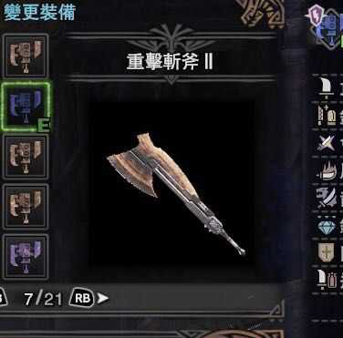 曾经辉煌过的斩斧,现在除了追求舒适外用途很少。基本上是用来特化非弱点会心打炎妃用了。