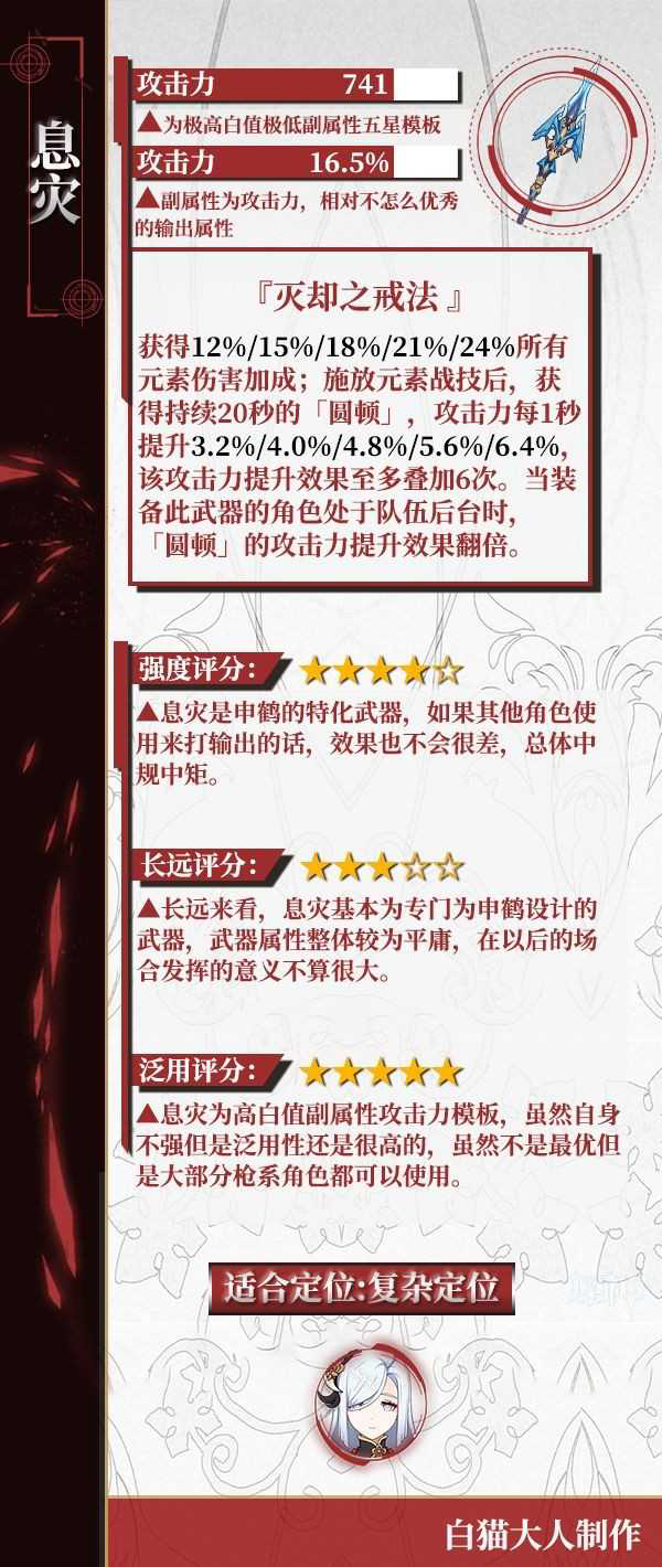 息灾是罕见的极高白值极低副属性武器,副属性为百分比攻击力。由于息灾基本是针对申鹤特殊机制而设计的武器,导致其在输出能力上只能说中规中矩。但是对申鹤的辅助能力可以说是一个不小的提升。