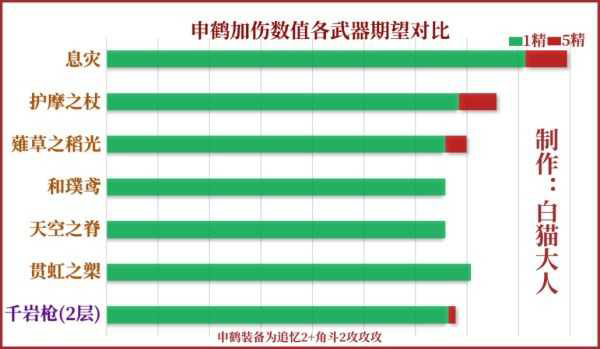 对于申鹤来说,五星武器中除了息灾之外的武器属性差距不大,个人比较推荐薙草之稻光和天空之脊,因为即提供了加伤数值又能附带一定的元素充能效率。(申鹤的元素充能效率保持在180%+为最佳)。四星武器比较推荐千岩长枪,因为考虑到申鹤配队较为复杂,这里取了一个相对保守的2层作为计算。