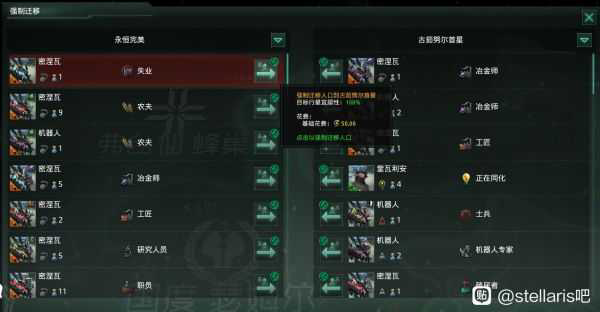 在那之后,如果买人口买过头了的话也不用担心,首先,我们是威权,是有奴隶的,在这里,移民奴隶pop不需要花费影响力,但是要记得你的奴隶是契约奴隶,不然可能会出现奴隶pop失业的情况。再之后,威权奴隶有个更大的特点在于,如果上面没人,奴隶会摘掉脚链翻身做人上人。