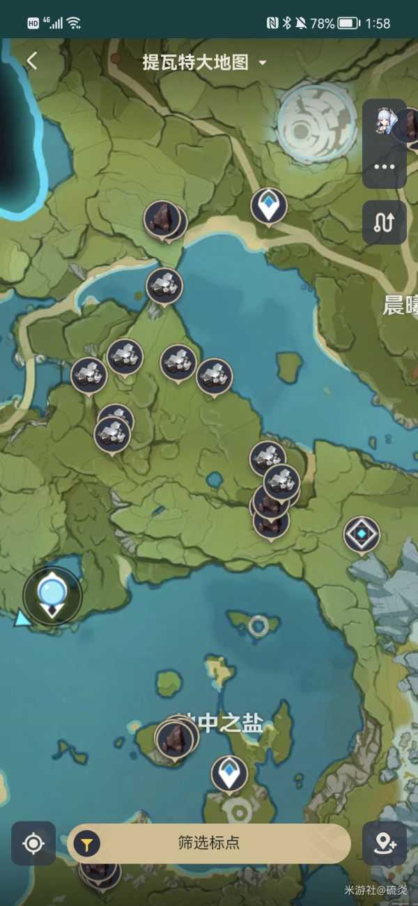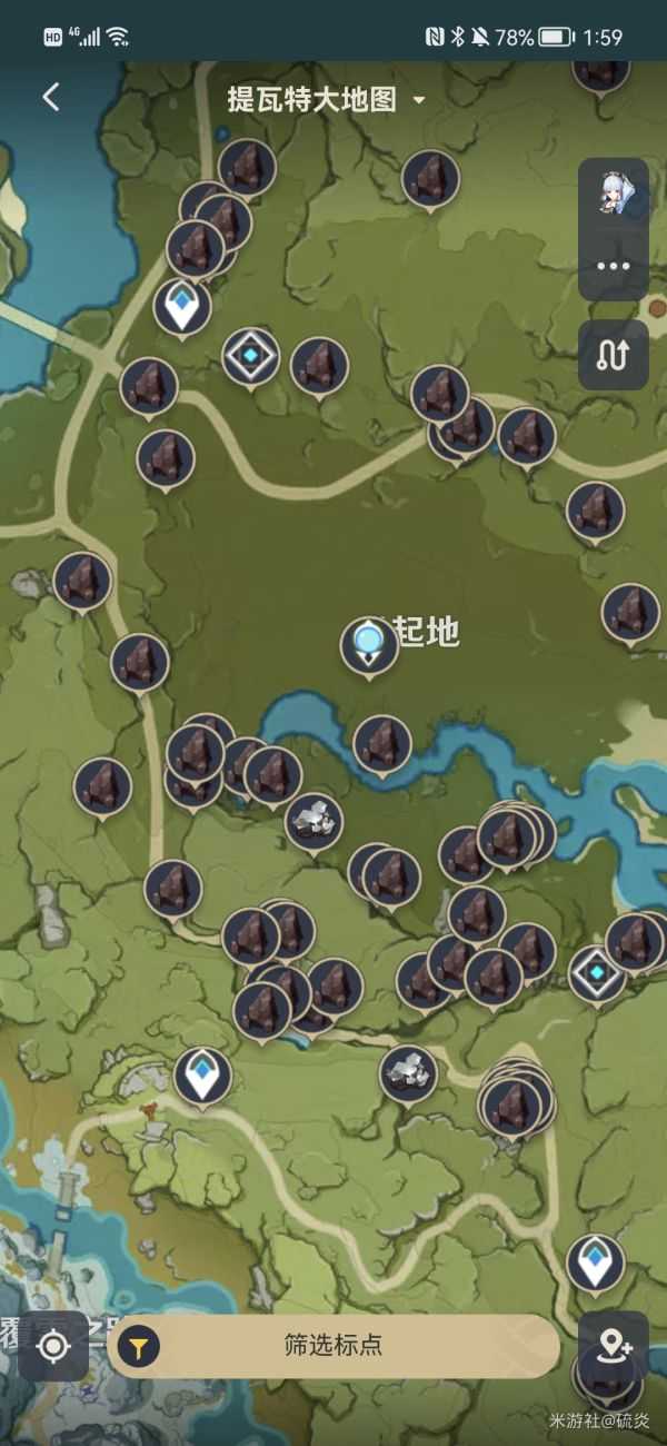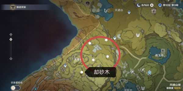 6.却砂木,在璃月大范围分广,我推荐在图中的传送点往层岩巨渊方向,圈圈里面基本上都是却砂木,来回刷就行了