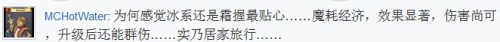 MCHotWater 说得好像很有道理 但DAI蓝量=公共CD 并且多人目前不会出现单人高级装备堆起来的属性膨胀 相比火系3技能35耗蓝量 冰握65耗蓝量简直蠢CRY