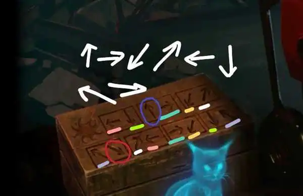 要切换到女主视角,在猫猫守着的盒子盖上,可以看到太阳图案,以及一些箭头。