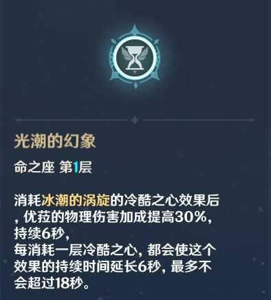 覆盖率极高的物理加成。在不考虑武器加成情况下,物伤杯+「苍白之火」4件套能够提供108.3%的基础加成,那么30%的提升约为14.4%。优菈的输出手法中,其爆发基本都能吃满这30%的物伤加成,因此整体提升在10%以上。