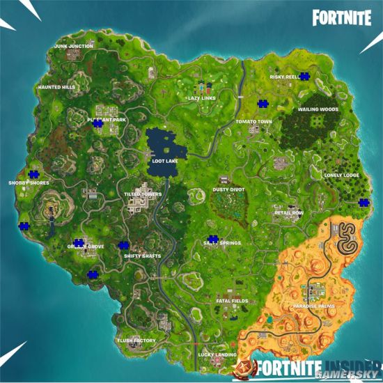 第5季,第10周的挑战之一是“在地下室中搜索拼图碎片”。在《堡垒之夜》地图上可以找到许多地下室,我们在下面的地图上突出显示了一些地下室。当你接近拼图碎片会听见明显的嘎嘎声。