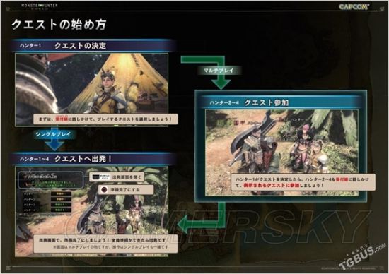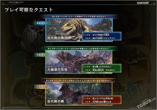 从这次的说明文件上看来,现场将提供三种难度的狩猎任务,环境则是古代林以及首次曝光的大蚁冢荒地,玩家届时可以根据自己对于游戏的熟悉度来选择狩猎目标,根据单人游玩以及多人模式提供不同目标,共计六种怪物可以讨伐。