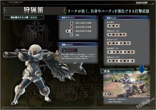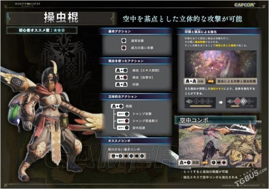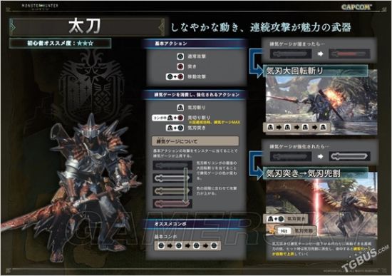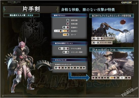 除了已经曝光的流程方式以外,这次直接揭露了在PS4版本的实际操作按钮,以及十四种武器的操作说明,虽然没有《怪物猎人XX》的狩猎风格以及狩技的特殊动作,但从官方说明书上推荐各种连击按法,可以一窥本作新增让狩猎动作更为流利的操作方式。