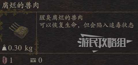 获取条件:将数个新鲜兽肉放在背包,找一个椅子坐下连续闭眼数日,兽肉会自动腐烂在背包里。