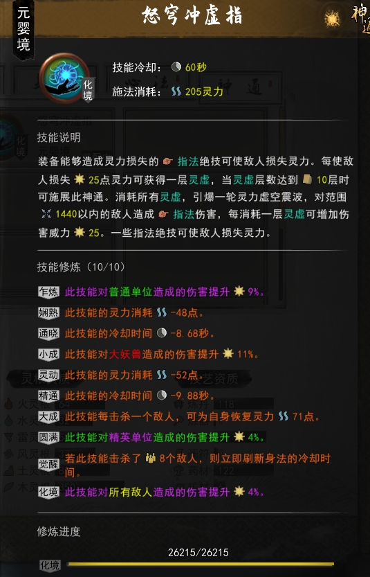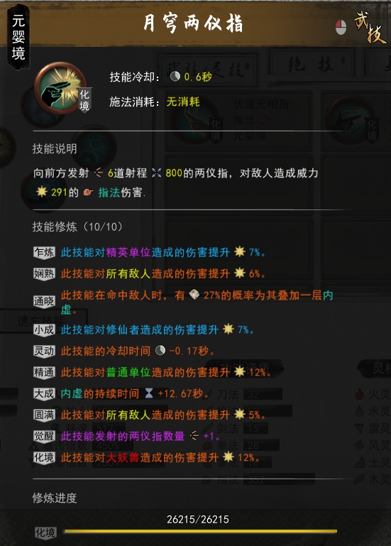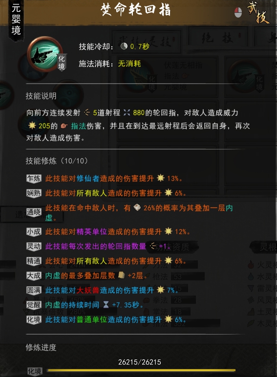 思路就是 开局先平a(武技)两下 然后空格(身法)这时候给对面叠3层内虚加上平a的层数 最高是10层 这时候就可以右键(绝技)引爆了 注意这里引爆之后疯狂平a 因为绝技用完之后会有个平a打蓝的buff 因为内虚的层数不等于神通所用的灵虚层数 而是引爆内虚后打掉的蓝才会加灵虚层数 而想跨阶杀敌 就要叠够30层灵虚 其实很简单 一般用绝技爆10层的内虚基本就是15层灵虚以上了 这时候用轮回指平a几下就够30层了 为什么必须用轮回指 是因为段数多打蓝快。