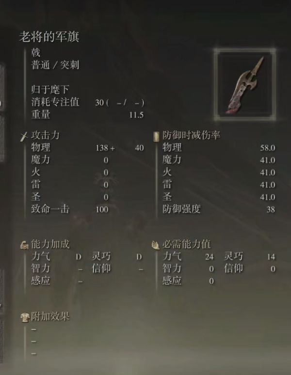 沼泽BOSS 属于老贼的怜悯 可以靠地形弓箭嫖死 死后掉落军旗 战技增加攻击力和防御力 精耗30 加成比大树守卫的武器高 精耗也比大树守卫的低10