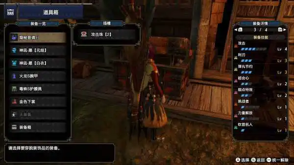 防具选择:除了技能可以出吹笛名人外没有任何特殊要求,防具挑防御力高的穿即可,例如:土砂头、骚鸟胸、蛮颚手腰、铸铁腿。