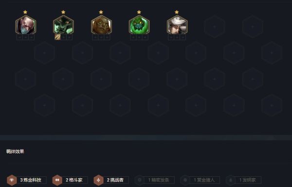 阵容这时候有5炼金+2挑战就优。如果没有蒙多可考虑3炼金+4挑战。阵容大部分棋子2星或有蒙多后再下卡蜜尔否则坦度不够。