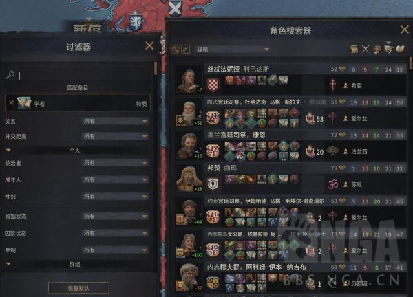 然后打开人物搜索学者特质,发现密谋24的只有两位,第一位不是我们家族没有那个特质,那么凶手就是另一位我的不知道哪路亲戚了!