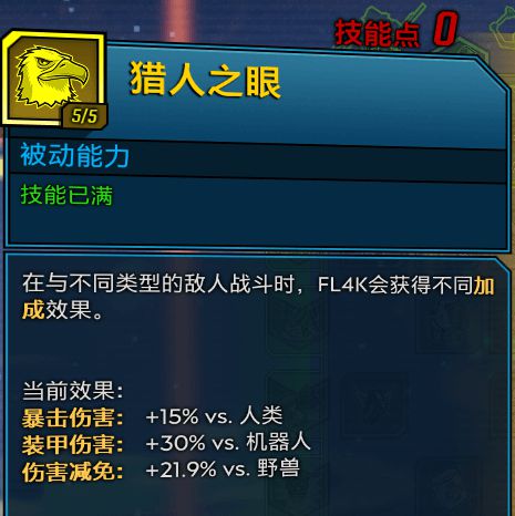 在造成枪械伤害时FL4K有3%几率激活已购买的任意猎人杀戮技能。