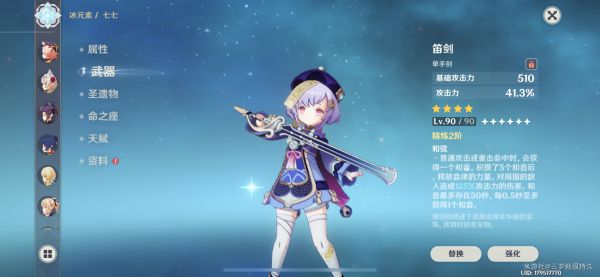 笛剑是七七的四星毕业武器哦!拥有着510的白字,还有大攻击副词条,很适合追求奶量的玩家使用,同时我自己也是用的笛剑。