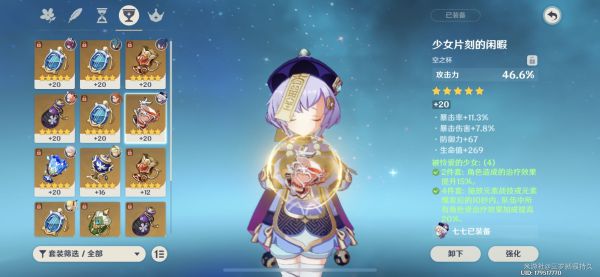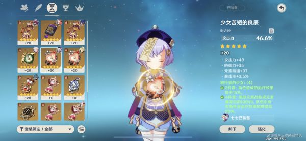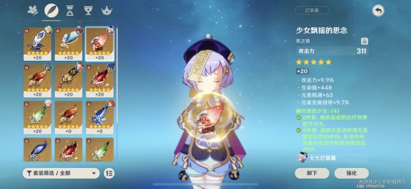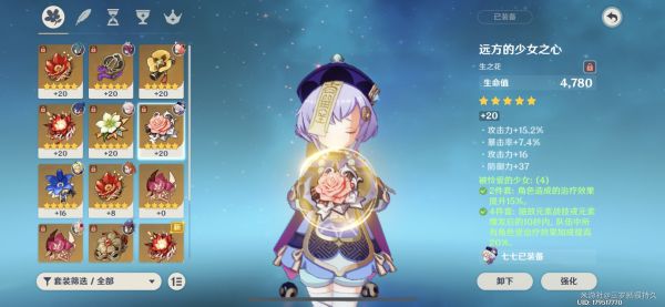 这张图我们可以看到,两条治疗量是按自身攻击来算的,和班尼特不同的是七七可以吃到所有攻击而不是只能吃到白字加成,圣遗物方面呢,七七作为一个纯奶妈,4少女是最适合七七的,2角斗士或者2追忆的攻击占比虽然高,但是少女加的是治疗效果,肯定不如加攻击的套装的,4少女是特别必要的!不过刷不到少女的也可以2少女2角斗士(2追忆也)过度啦!