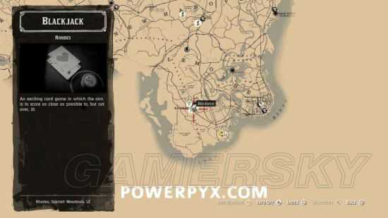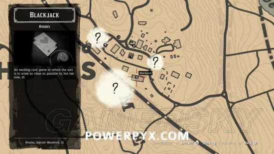 21点(BlackJack)是《荒野大镖客2》中的小游戏之一,可以在Rhodes(罗德镇)参与游玩,具体位置如下图所示:
