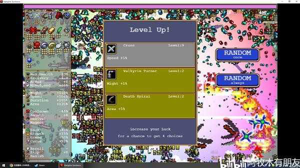 开游戏前又多了一个limit break的新选项,在你所有主被动道具都升满之后,不会再是无聊的金币鸡腿2选1了,你可以无限升级你的主动道具,比如攻击力、飞行速度、范围等等,在左上角可以查看对这个武器升级的次数。