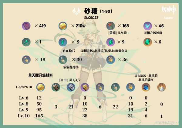 砂糖一是提供元素精通加成,二是自身作为输出角色时更多是以元素反应所产生的伤害为主,因此对于天赋1/2/3的等级,甚至可以不进行提升;